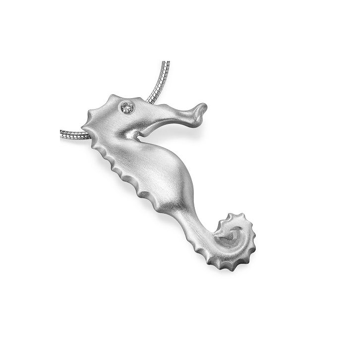 Satin finished solid 18ct white gold seahorse pendant with a 2mm diamond by Reef Jewelry