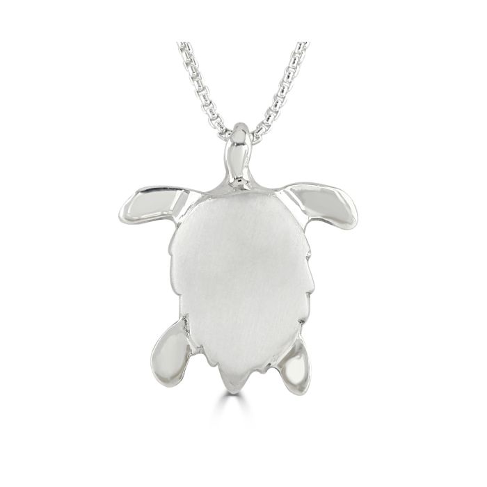 Satin finished solid silver turtle pendant with a satin finished shell and polished legs. Handmade by Reef Jewellery